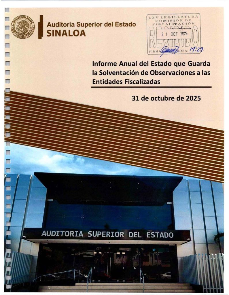 La Auditoría Superior del Estado de Sinaloa cumplió puntualmente con la entrega del Informe Anual sobre el Estado que Guardan las Solventaciones de Observaciones correspondientes al ejercicio fiscal 2024, ante la Comisión de Fiscalización del Congreso del Estado.